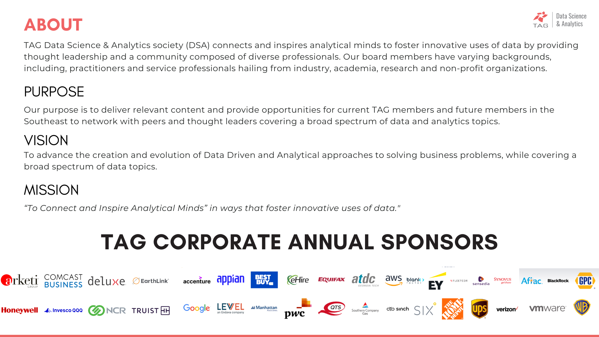 TAG Data Science & Analytics Society is hosting a social event to bring together data and analytics-minded technology as well as business professionals.